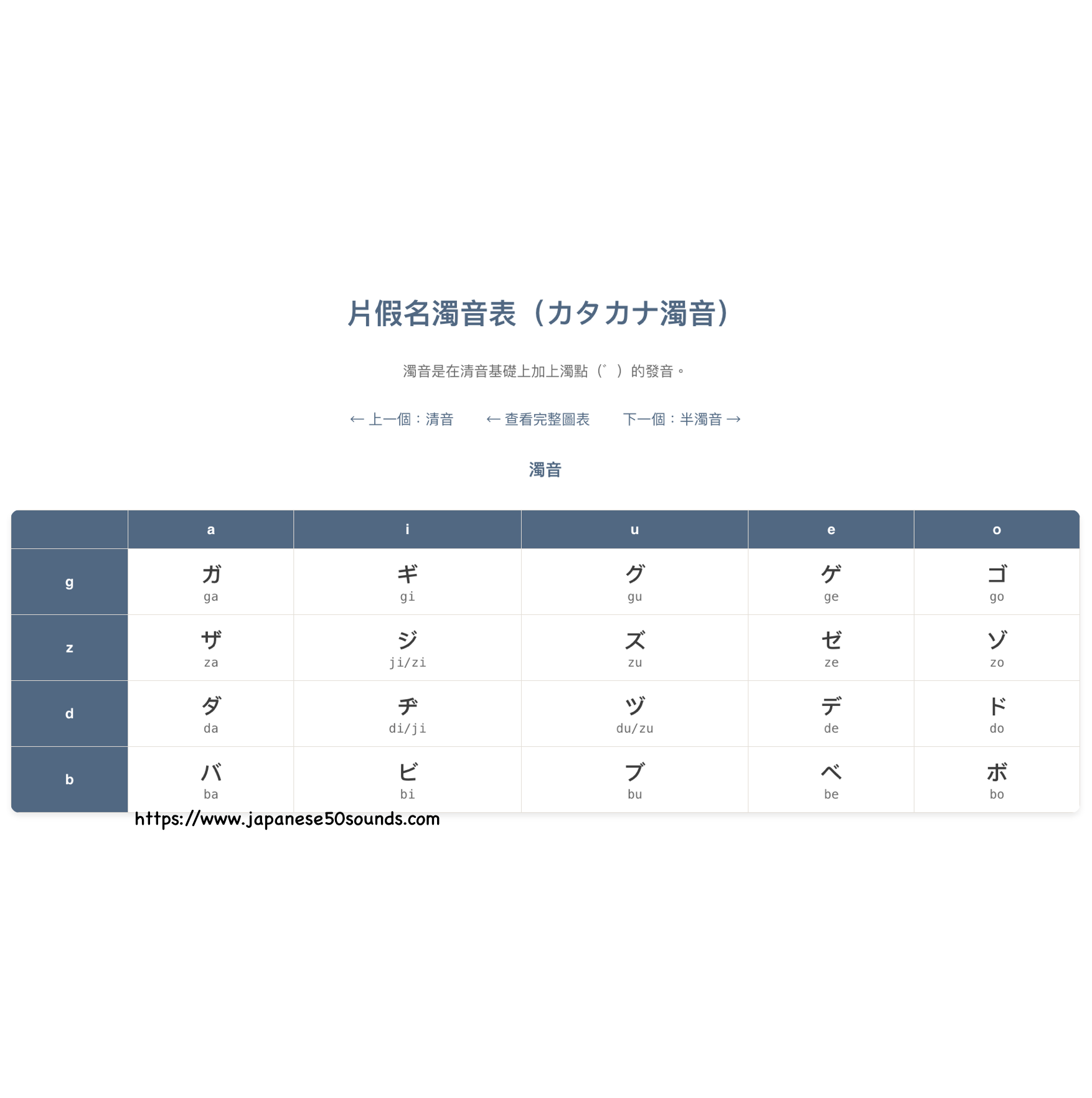 濁音是在清音的 k, s, t, h 行的右上角添加濁音符號 " 而成,發音時需要震動聲帶。
