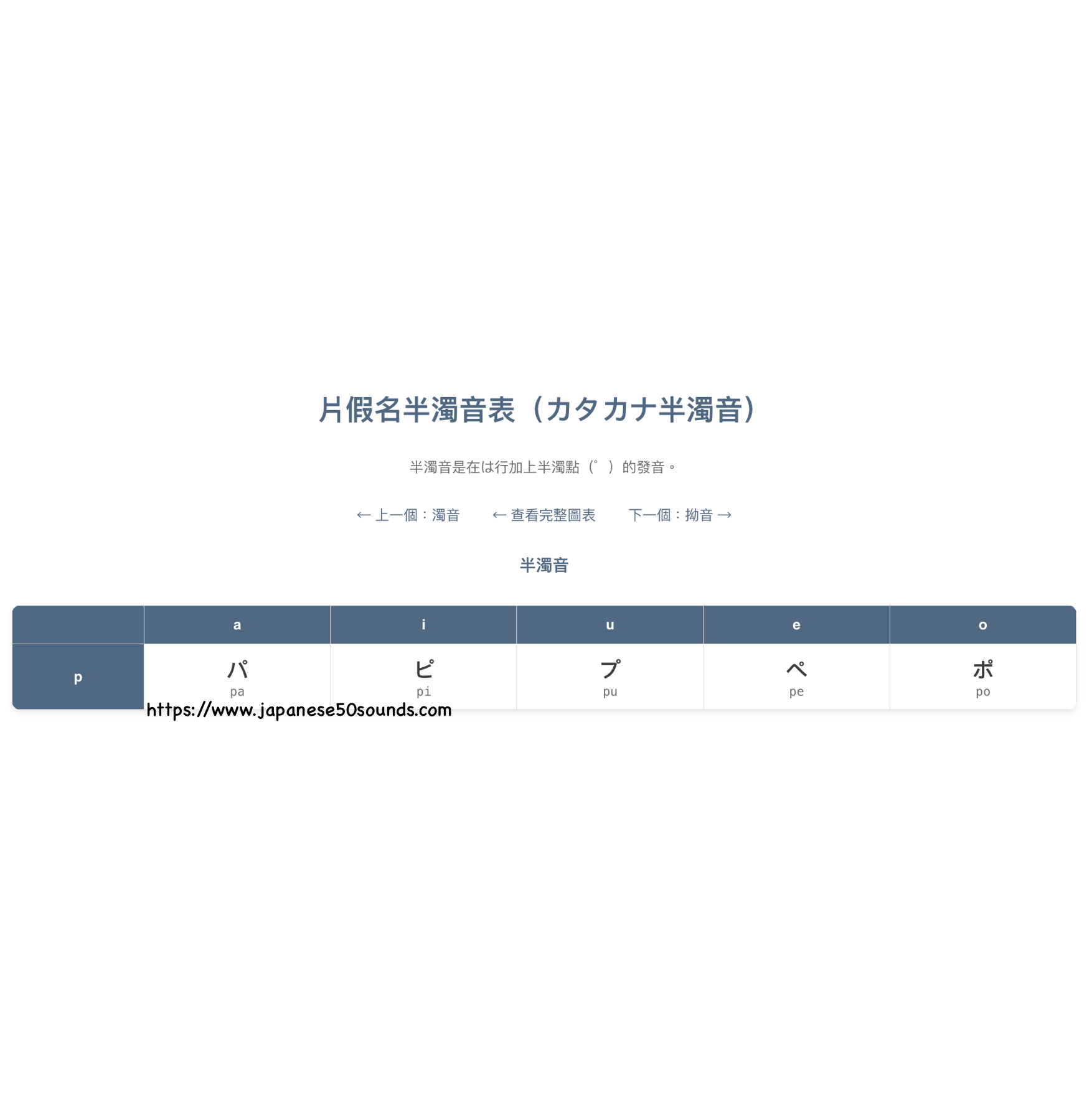 半濁音是在ハ行的右上角添加半濁音符號圓圈 ゜而成,只有 p 行。