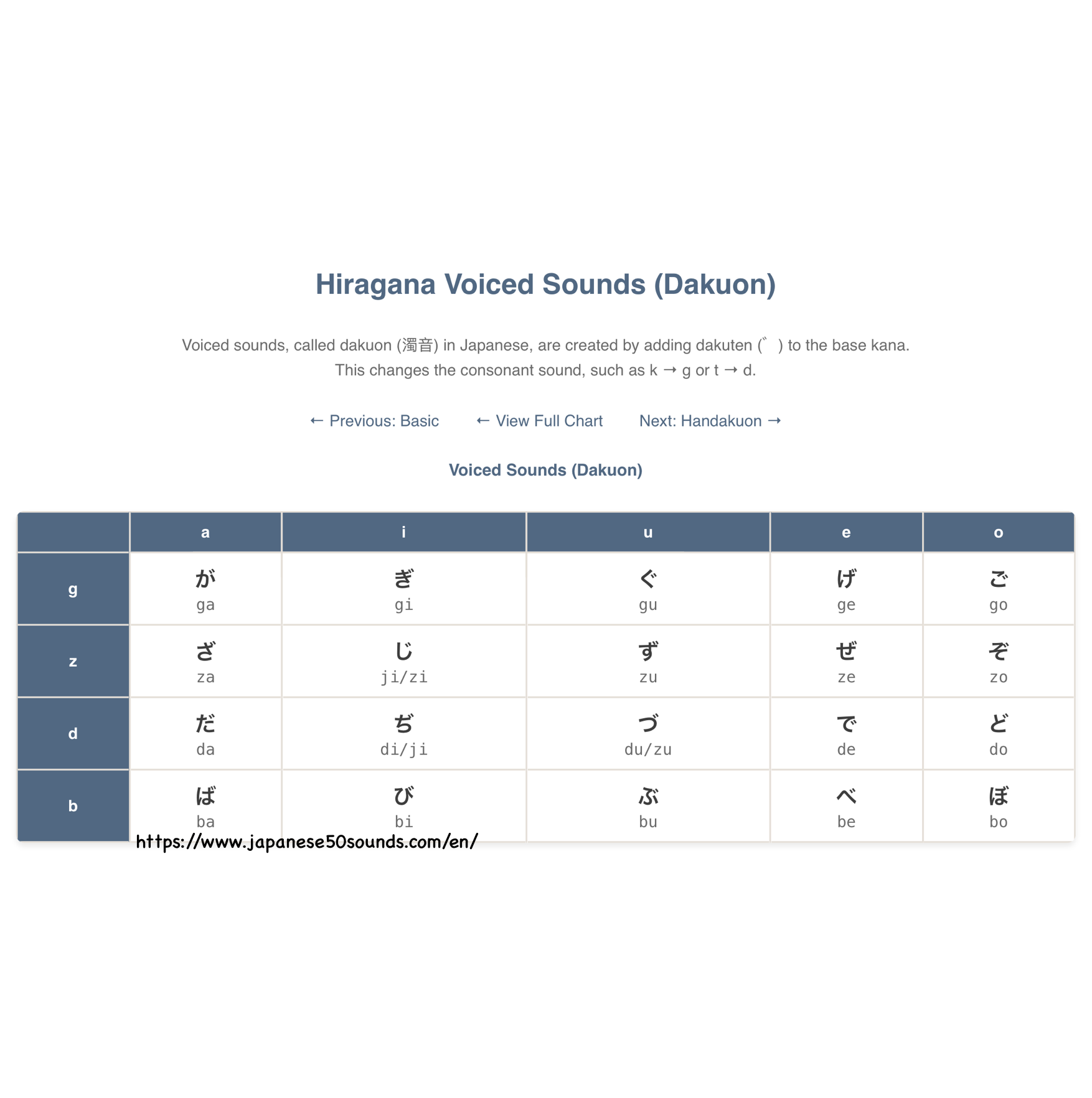 Voiced sounds, called dakuon (濁音) in Japanese, are created by adding dakuten (゛) to the base kana. This changes the consonant sound, such as k → g or t → d.