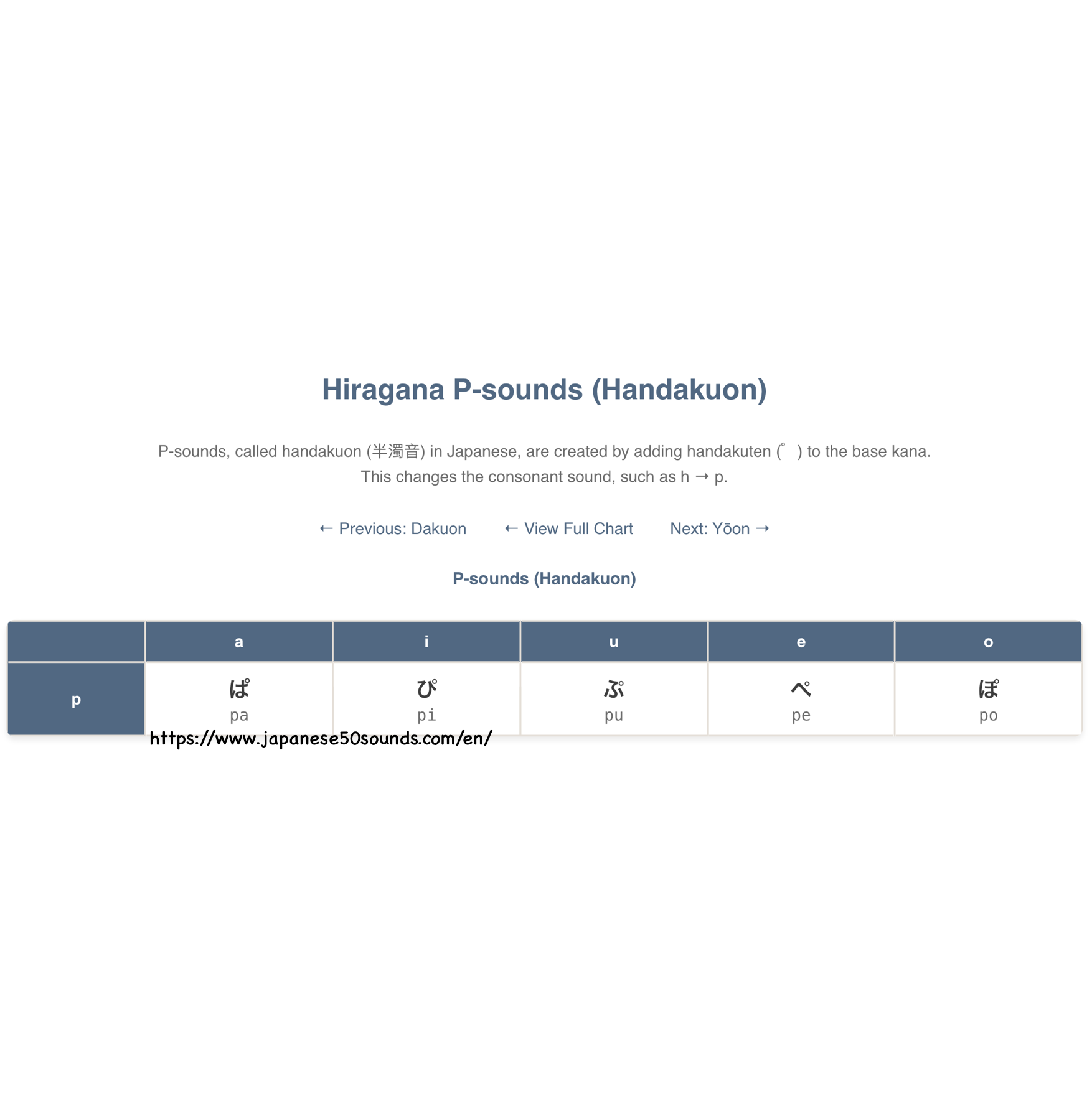 P-sounds, called handakuon (半濁音) in Japanese, are created by adding handakuten (゜) to the base kana. This changes the consonant sound, such as h → p.